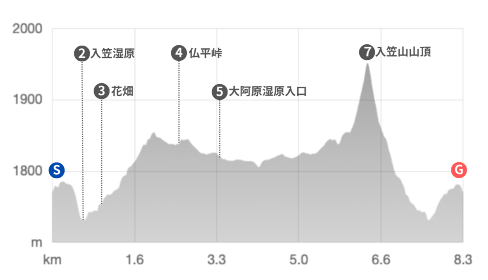 - コース概要:ゴンドラ山頂駅 → 入笠湿原 → 花畑 → 山頂 →(大阿原湿原)→ 周回